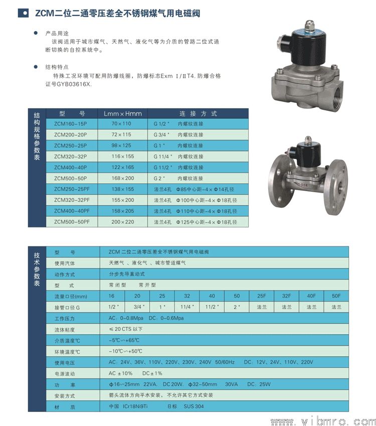 ZCM320-32P二位二通零压差全不锈钢煤气用电磁阀