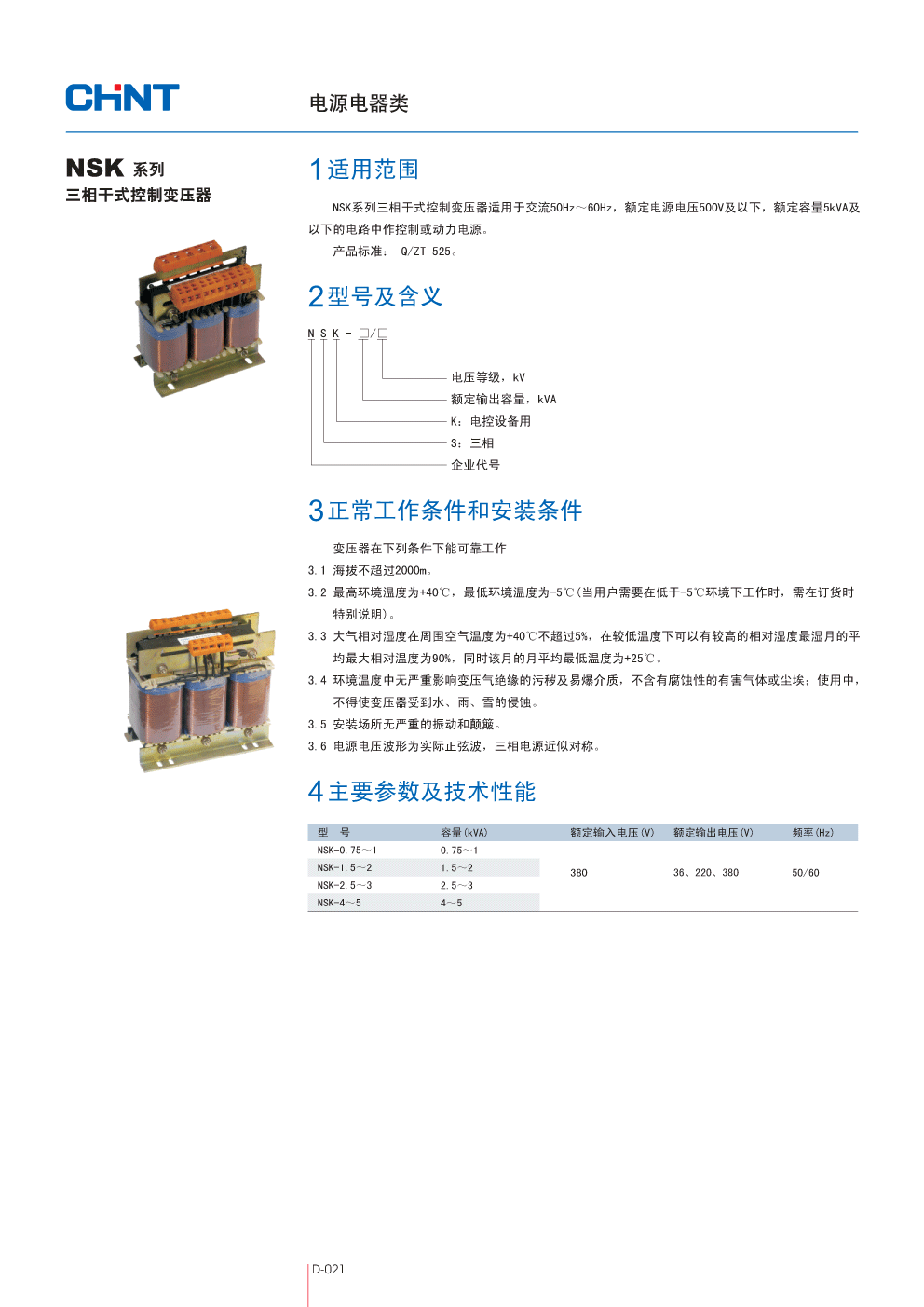 适用于交流50Hz~60Hz,额定电源电压500V及以下,额定容量5kVA及以下的电路中作控制或动力电源。产品标准: Q/ZT 525