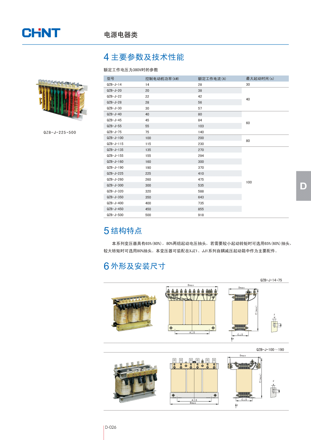 适用于交流 50Hz~60Hz,额定电压380V(660V或220V的产品可定制),额定输出功率400kW及以下的三相鼠笼型感应电动机,作不频繁操作条件下的降压起动,利用变压器降压的特点,降低电动机的起动电流,以改善电动机起动时对输电网络的影响 | |